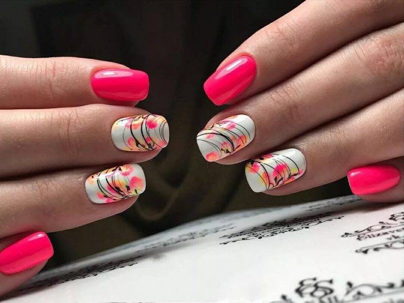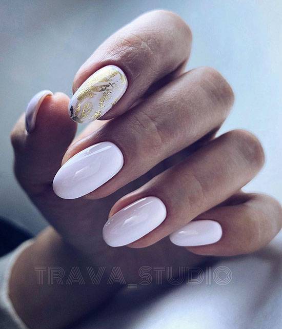 Не менее красиво и ярко смотрится нейл-арт в белом тоне (неслучайно это цвет гармонии и желания начать все с «чистого листа») с выделенным безымянным пальцем и мизинцем. Чтобы маникюр выглядел эффектнее, акцент стоит делать алым, розовым или красным гель-лаком. Еще один интересный вариант маникюра, когда один палец накрашен другим цветом, а второй выделен при помощи изящного принта.
