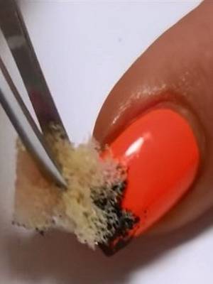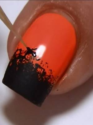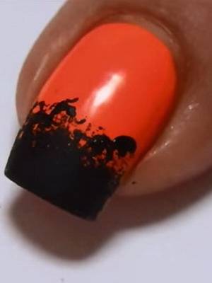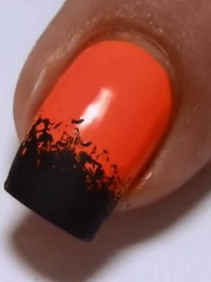 2. В нижней части ногтевой пластины при помощи черного лака нарисовать изогнутую линию, закрасить им поверхность ногтя. На искусственных ногтях край ногтя также должен быть закрашен. Дождаться, когда лак высохнет.