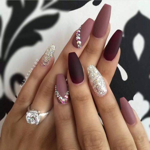 Можно подобрать вечерний маникюр не только по цветовой гамме, но и по текстуре ткани. Например, глянцевый маникюр отлично сочетается с нарядом из шелка или атласа, под бархатное платье (или наряд из других матовых тканей) насыщенного цвета подойдет матовый маникюр. Также превосходно смотрятся комбинации матового и глянцевого покрытия с применением дополнительных элементов декора. Бархатное покрытие легко создается при помощи ворсинок флока, которые надежно крепятся на свежий лак.