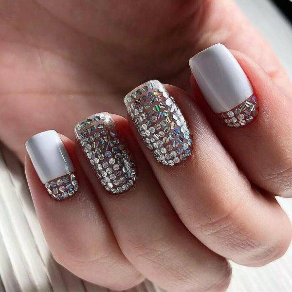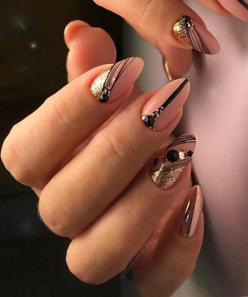 Например, нюд + блестки, которые широкой полосой пересекают ноготь по центру, привлекая внимание окружающих
