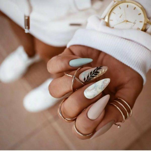 Миндальные ногти считаются самыми удобными в работе. Ведь в этом случае выбор маникюра не ограничен, на такую форму подойдет любой стиль, дизайн, декор. Здесь будет прекрасно смотреться минималистический вариант в нюдовой или пастельной палитр, а яркий акцент в виде контрастных рисунков и декора доведут дело до конца.