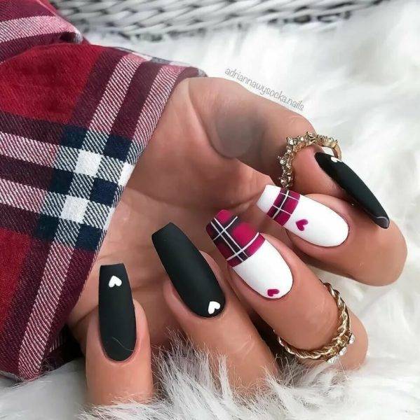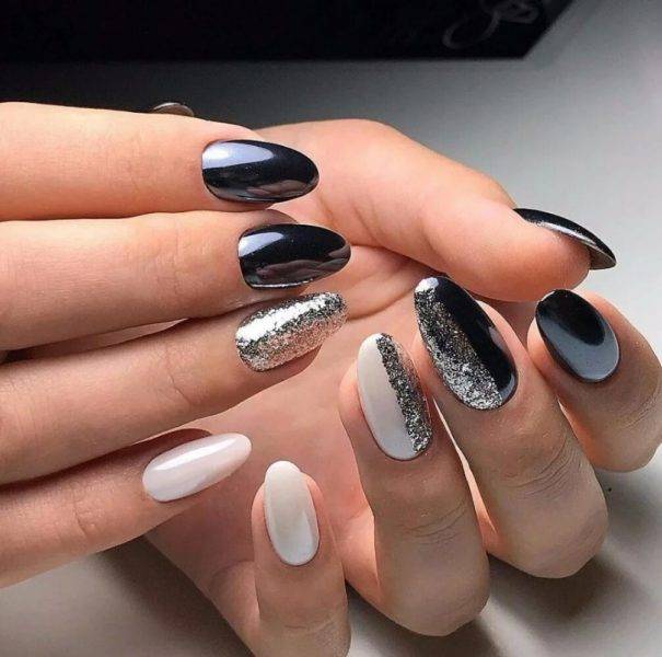 Многие люди не считают черный лак для ногтей праздничным выбором, и не зря! Стоит добавить к этому накладному дизайну серебряную или золотую фольгу или сделать черно-белый маникюр, как пальцы станут стильным, праздничным элементом образа. Вы можете быть в центре внимания не только во время праздников, но и в повседневной жизни после них.