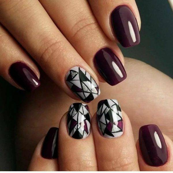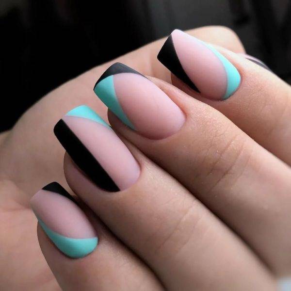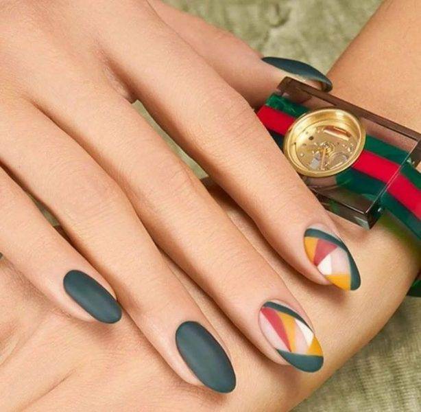 А ногти на руках, кроме среднего и безымянного пальцев – бирюзовым или другим цветным насыщенным лаком, на оставшихся среднем и безымянном – трехцветный геометрический дизайн. Геометрия в нейл-дизайне маникюра и педикюра доступна, лаконична, невероятна эффектна и открыта для новых стильных идей.