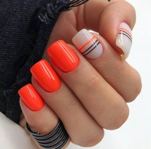 Насыщенный красный, синий, терракотовый, оранжевый, зелёный, малиновый или лимонный, а также золотистый или серебристый лак в этом случае как раз то, на что стоит обратить внимание