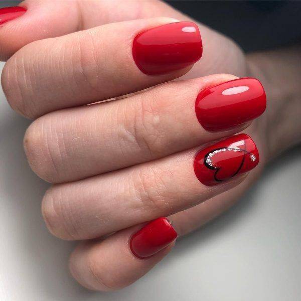 Безусловно, самым подходящим узором являются рисунки, связанные с темой любви: сердечки, ангелочки, влюбленные пары, бутоны цветов. Красиво на красном гель-лаке будет выглядеть черное сердце, дополненное золотым глиттером. При нанесении рисунка следует избегать резких переходов, зигзагов и скрещенных линий.