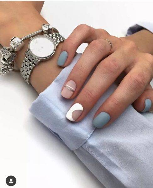 В моде также минималистичный дизайн: лунный маникюр и френч. Их можно, кстати, совместить в нейл-арте. Или оформить в одной цветовой гамме, выбрав френч для маникюра, а выделение лунок — для педикюра. Геометрия тоже не сдает позиций.