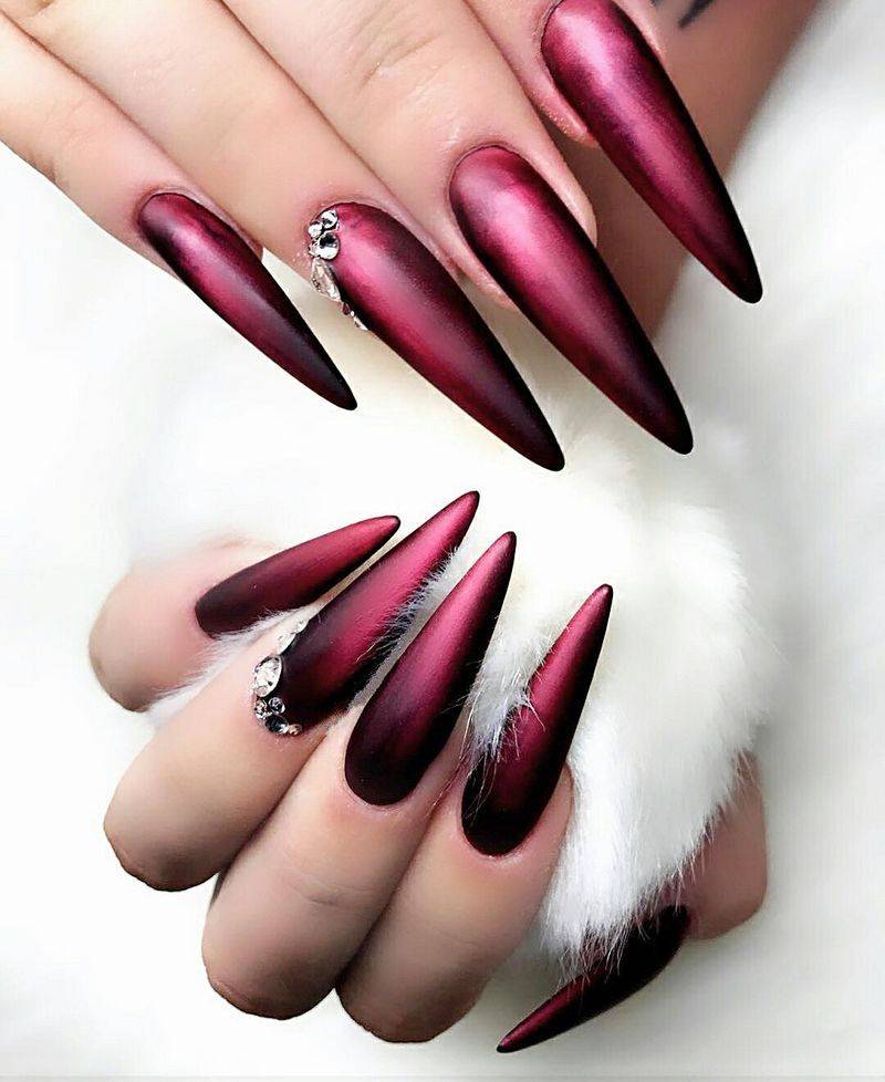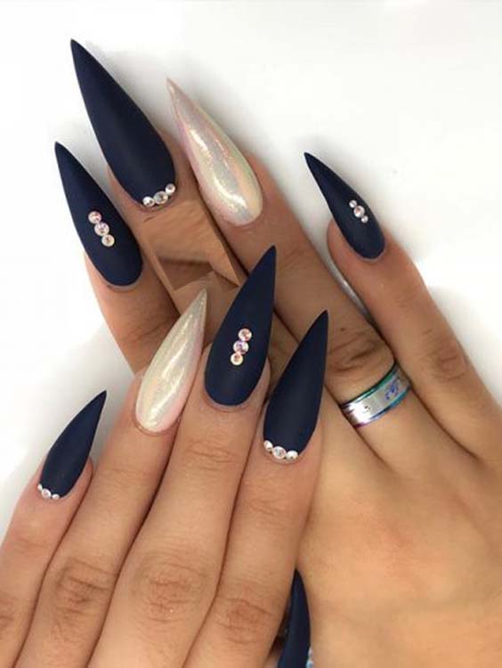 - Матовые лаки. Острые матовые ногти – это уникальное решение для любого повседневного и вечернего лука. Дизайн можно выбрать однотонный или более оригинальный. Для украшения матового покрытия используйте цветы, винтажные узоры, глиттер или стразы.