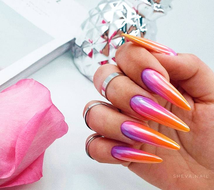 Сверху ногти покрывают серым, оранжевым и розовым гель-лаком. Для более яркого эффекта можно сверху нанести прозрачный блестящий слой.