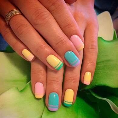 При создании дизайна обратите внимание, что в качестве основы следует выбирать самый светлый оттенок гель-лака. Отличным вариантом станет подложка лимонного цвета. Сверху ногти покрывают серым, оранжевым и розовым гель-лаком
