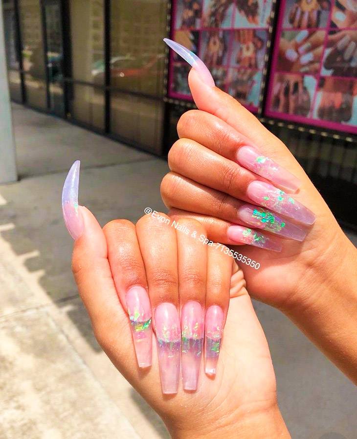 Все чаще можно увидеть именно прозрачный длинный маникюр на женских руках, и это совсем не бесцветное покрытие. Это довольно необычный, интересный, эффектный и вместе с тем натуральный маникюр.