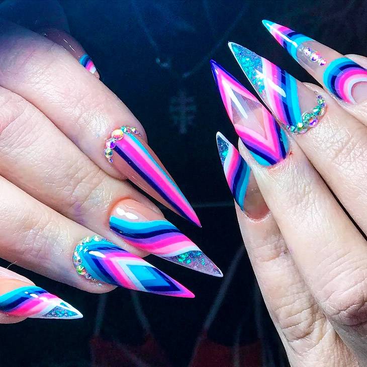 Разноцветный и яркий маникюр с дизайном на длинных ногтях притягивает к себе взгляды. Отличный сногсшибательный вариант для лета, отдыха и вечеринок. Он предполагает окрашивание каждого ногтя в другой цвет. Но чтобы образ смотрелся гармонично, необходимо правильно подбирать цветовую гамму лака.