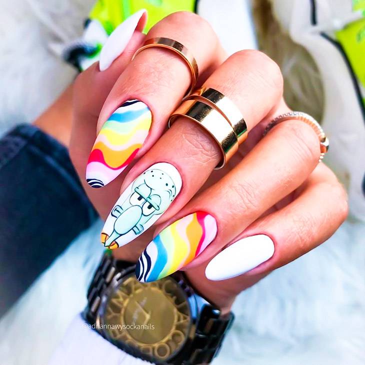 Броская абстракция завоевала списки модных трендов не только в фэшн-индустрии, но и в мире маникюра. Не бойтесь сочетать красочные оттенки и яркий декор. Тандем белого горошка, космических разводов и разнообразных линий — все это смотрится круто и новомодно. С таким дизайном вы будете выглядеть суперстильно и молодежно.