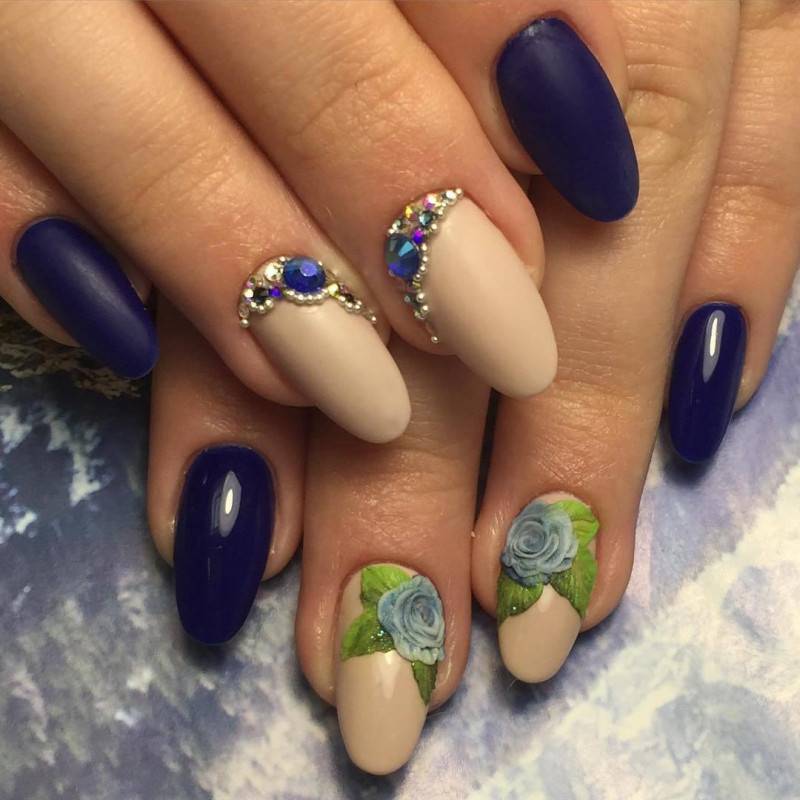 Насыщенный синий маникюр добавляет глубины и аристократичности, но наряд к нему следует подбирать тщательно. Синий фон маникюра подчеркнет платья светло-серого и серебристого цвета, хорошо будет выглядеть сочетание глубокого синего с отливом материала наряда и такого же маникюра. Маникюр темно-синего цвета уместно разбавлять белым и серебристым рисунком. Платья василькового и бирюзового цветов будут стильно подчеркнуты маникюром нежно-голубым с белым. Оттенки синего цвета в маникюре неплохо выглядят с черными нарядами, но они мало подходят для выпускного вечера, так как образ становится тяжелым.