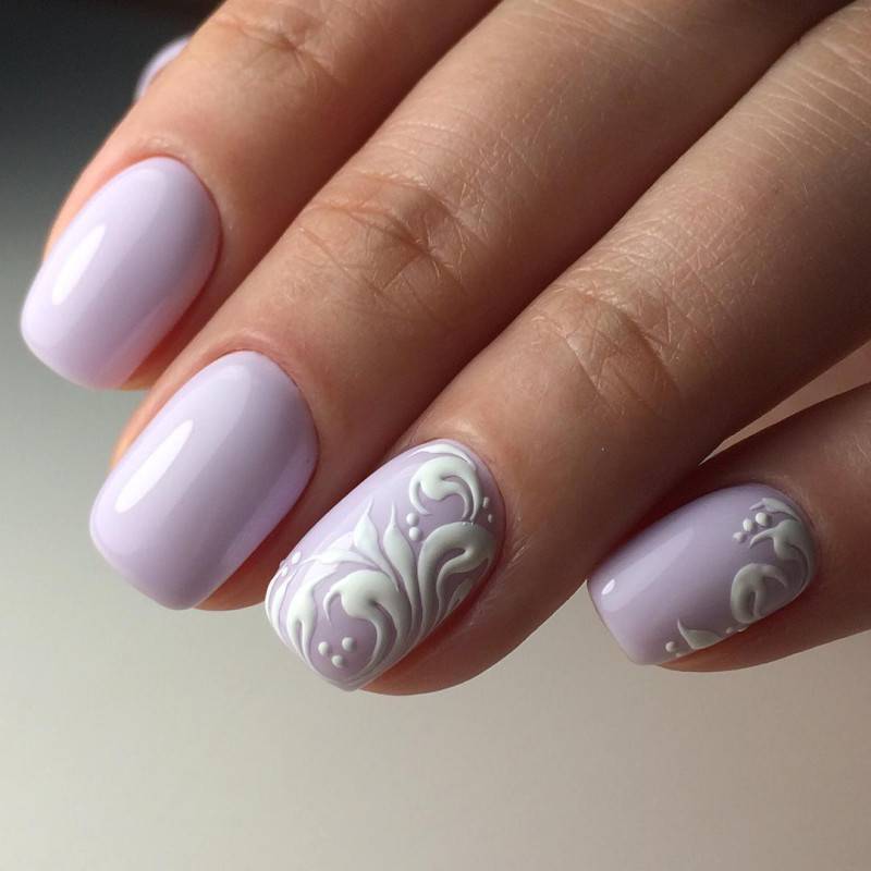Маникюр сиреневых оттенков от бледно-лилового до насыщенного фиолетового будет отлично смотреться с нарядами черного, белого, бордового цвета, идеален образ, где маникюр на тон светлее или темнее цвета праздничного наряда на выпускной. В дизайне маникюра сиреневых оттенков уместны серебро и белый цвет, черный рисунок слегка «утяжеляет» образ.