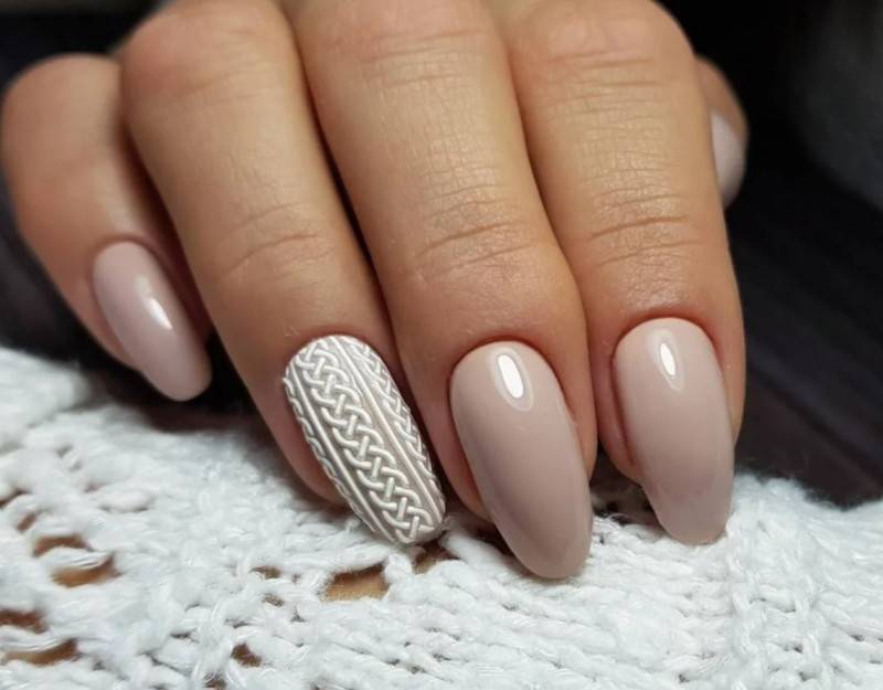 - Песочная вязка. Подходит для средней длины. Внешне такой рисунок напоминает вязанную косу. Особенно эффектно этот дизайн ногтей смотрится на матовой и нюдовой поверхности.
