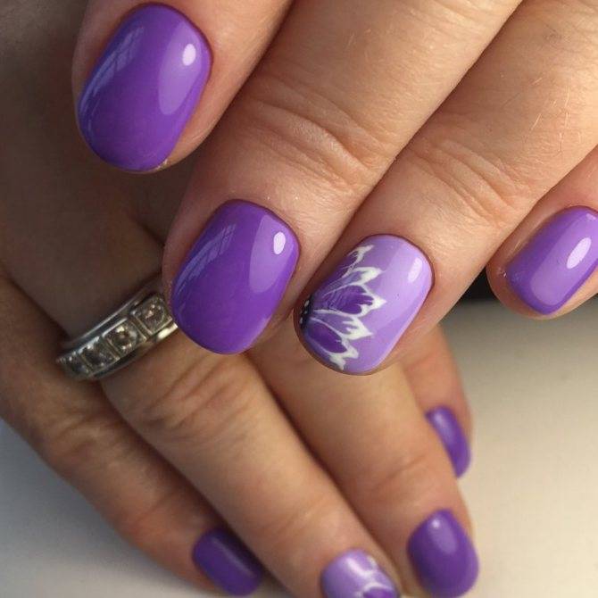 Маникюр сиреневых оттенков от бледно-лилового до насыщенного фиолетового будет отлично смотреться с нарядами черного, белого, бордового цвета, идеален образ, где маникюр на тон светлее или темнее цвета праздничного наряда на выпускной. В дизайне маникюра сиреневых оттенков уместны серебро и белый цвет, черный рисунок слегка «утяжеляет» образ.