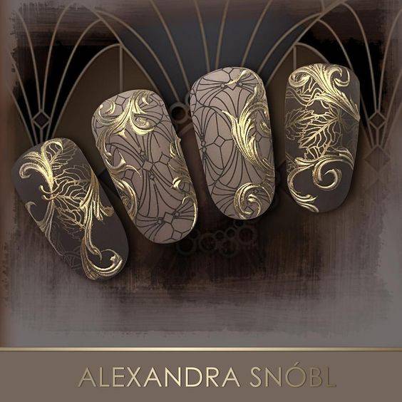 Необычные вензеля, которые переплетаются из одного в другой – это очень женственный вариант для молодой девушки. Кружевной маникюр сделает вас неотразимой. Наносить узоры можно с помощью тонкой кистьи или дотсом. Отдельные элементы можно «пропечатать» фольгой для литья. Этот шикарный и элегантный вариант прекрасно гармонирует с платьем любого фасона и в любых тонах.