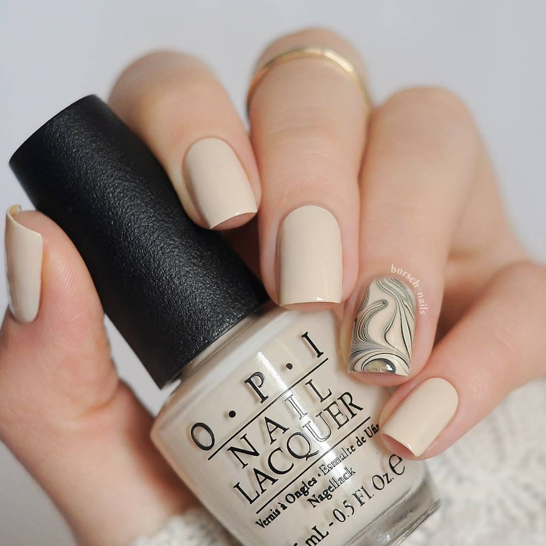 Представляет собой технику нанесения методом смешения лака с водой. Если выполнять такой маникюр в цветной технике, тогда он подходит для средних и длинных ногтей, но в черно-белом цвете будет смотреться аккуратно и на короткой ногтевой пластине.