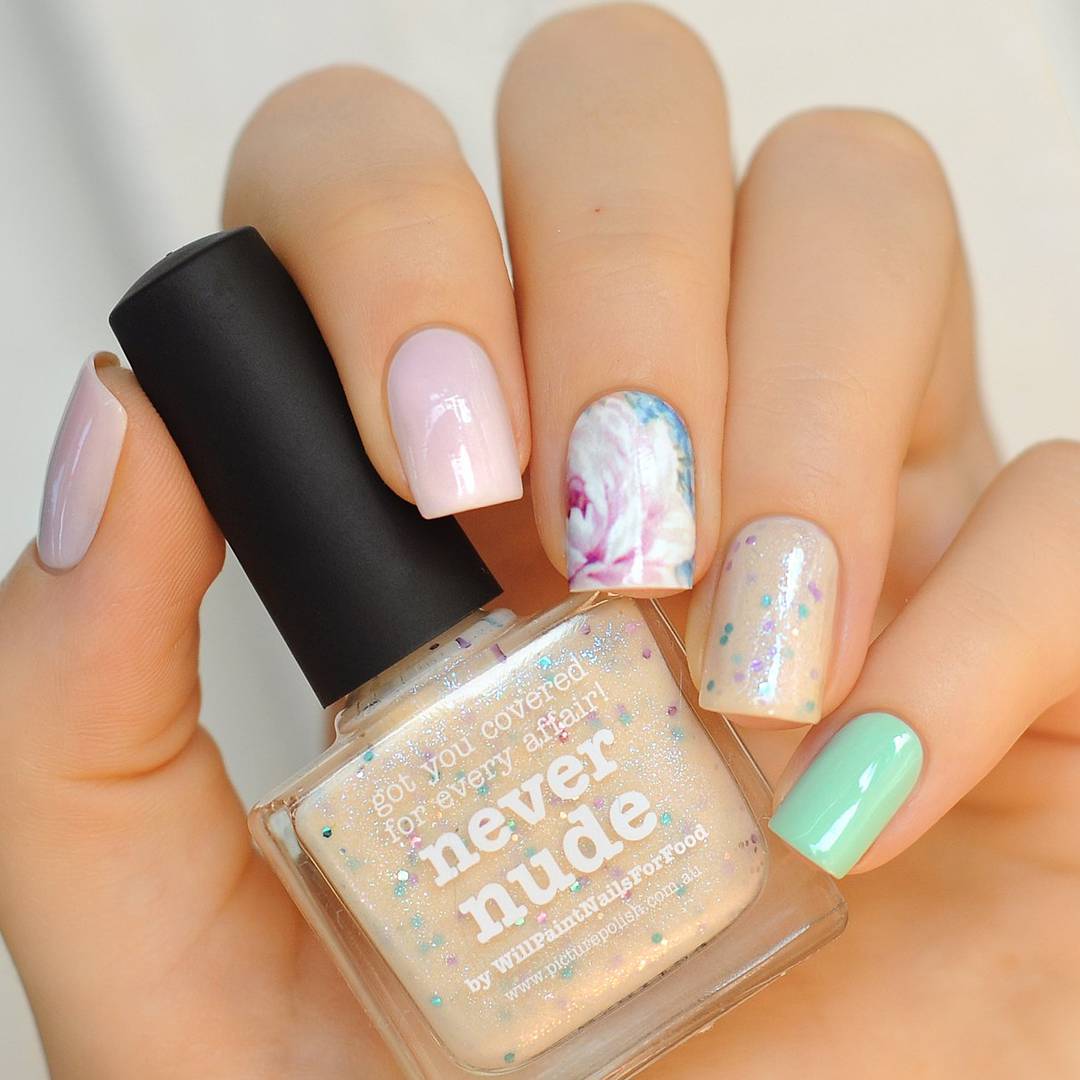 Яркий маникюр подойдет к однотонному нежному наяду.