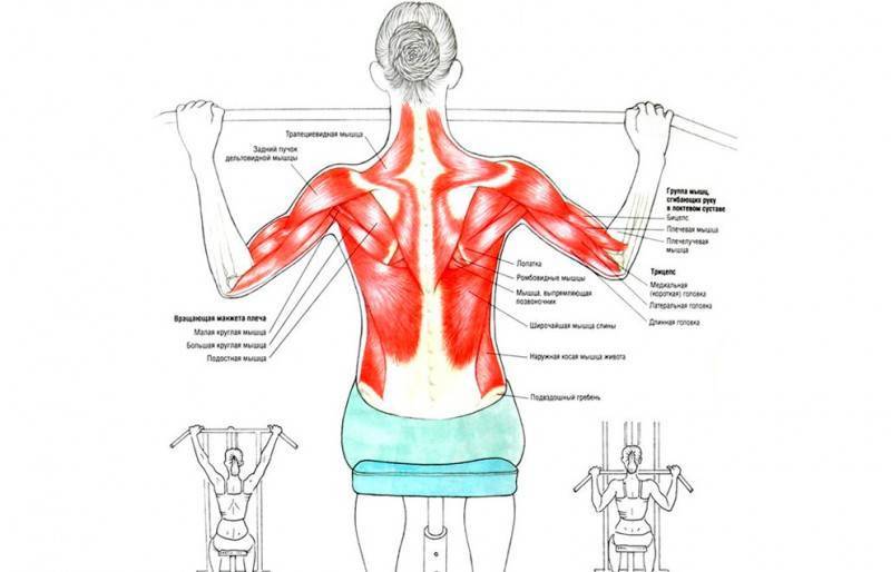Выполняется широким хватом, рукоятку можно опускать к груди или за голову. Корпус отклоните немного назад, на выдохе медленно опускайте перекладину вниз, сводя лопатки. Следите, чтобы в пояснице не было большого прогиба. Остановитесь в нескольких сантиметрах от груди и замрите на несколько секунд, затем плавно верните перекладину в исходное положение.