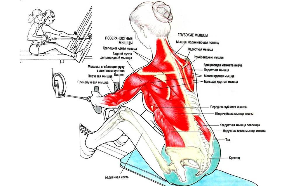 Если в вашем фитнес-зале есть гребный тренажер, можете использовать его. Принцип работы в нем схожий, только задействуются в том числе и ноги.