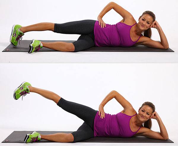 Еще одна разновидность махов ногами – боковые. Нужно лечь на бок, оперев одной рукой голову. Вторая рука вытягивается вдоль туловища. Ноги незначительно сгибаются в коленях. Вверх поднимается одна нога, образуя прямой угол с полом. Выполнив такое упражнение 20 раз, нужно сменить положение, лечь на другой бок и повторить махи второй ногой. Для начала желательно сделать 3 подхода.