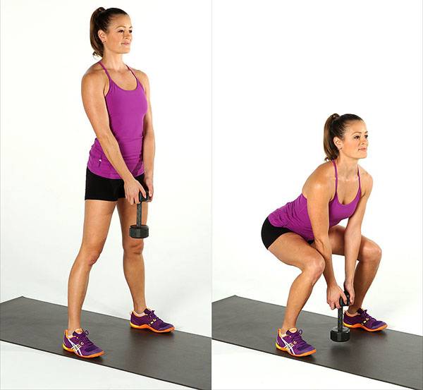 Специалисты рекомендуют обязательно включить в комплекс занятий приседания. Во время выполнения этого упражнения работают ягодичные мышцы и бедра. Во время приседания необходимо поставить ноги на ширине плеч и медленно опускать попу на уровень ниже коленей, а потом возвращаться в исходную позицию. Для большей эффективности можно взять в каждую руку по гантели. Сначала нужно делать около 15 приседаний, а затем постепенно увеличить нагрузку.