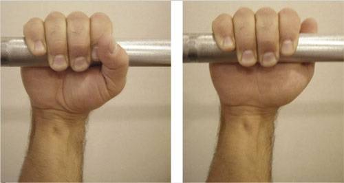• закрытый хват — большой палец обхватывает перекладину и находится на противоположной стороне по отношению к другим; • открытый (обезьяний) – большой палец размещен на той же стороне, что и остальные пальцы.