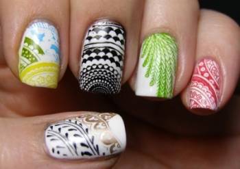 Что касается стемпинга, то в этом случае подобное приспособление представляет собой набор из штампа, доски с мотивами и скребка для удаления излишнего слоя лака. Наносите выбранный оттенок покрытия на интересующий вас узор, удалите лишнее, плотно прижмите штамп к изображению и перенесите рисунок на ногти.