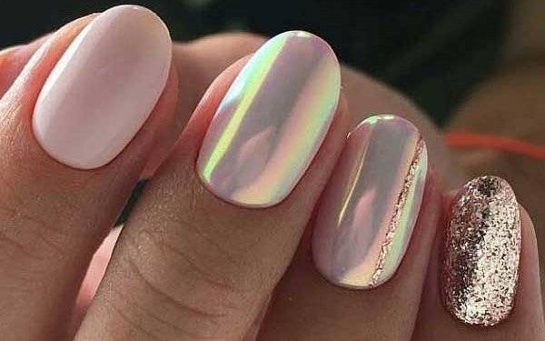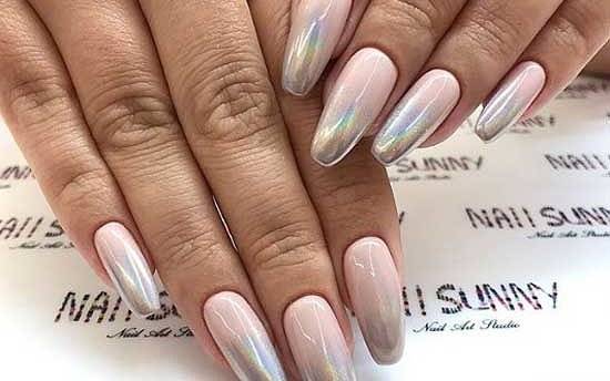 Ногти, покрытые маникюром жемчужного цвета, смотрятся нежно и в то же время скромно. Не стоит пытаться комбинировать жемчужное покрытие с разными другими. Ему подходят только однотонные цвета лака.