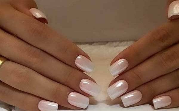Удачно выглядит жемчужное покрытие с пудровой втиркой нежных розовых и белых тонов на коротких ногтях.