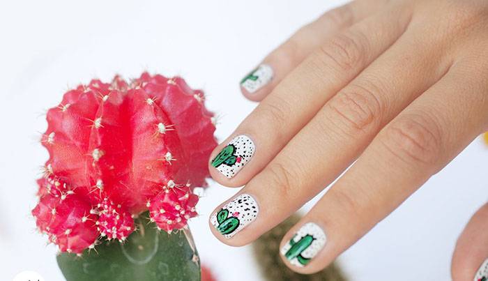 Многие девочки выбирают в качестве узора необычные растения. Больше всего им нравятся кактусы. Как основу для маникюра можно взять нежно-зеленый цвет и сверху нарисовать кактусы. Интересно будет смотреться в сочетании с матовым топом.