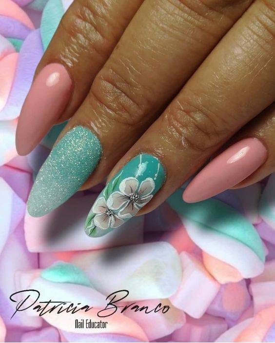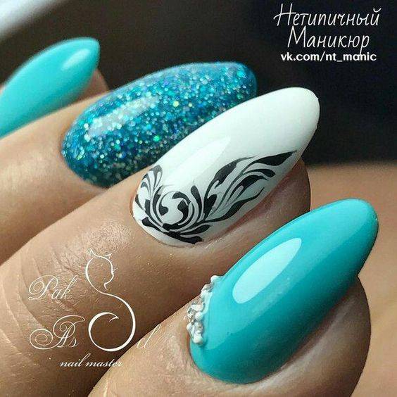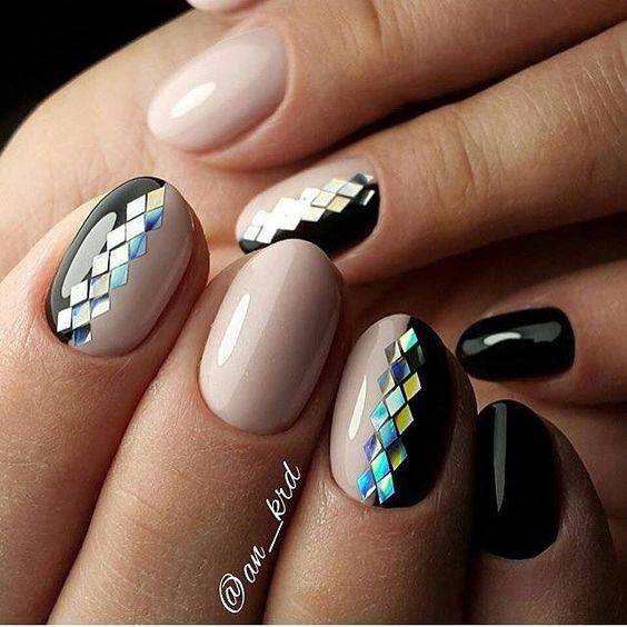 Для ежедневного образа подойдут пастельные оттенки. При необходимости другим цветом можно выделить ноготь на одном из пальцев одной или обеих рук. Классический вариант — черно-белый маникюр с блестками. Акцентный ноготь на руке можно декорировать блестками.