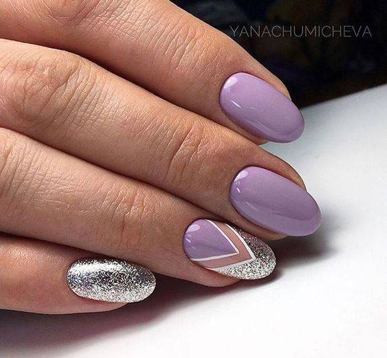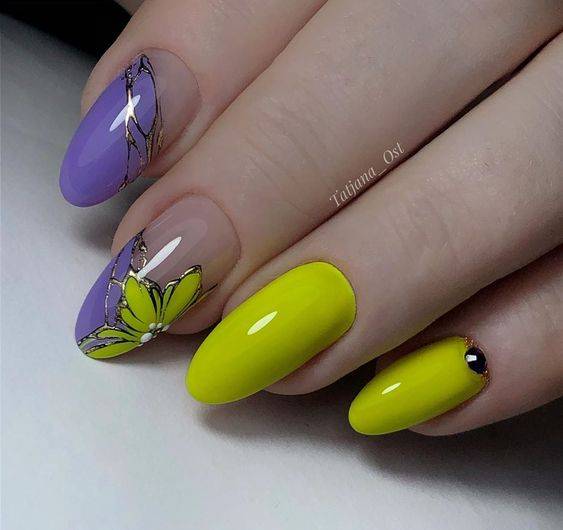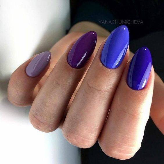 Для ярких вариантов маникюра на разные руки подойдут все составные хроматические цвета: зеленый, фиолетовый, оранжевый или их оттенки.