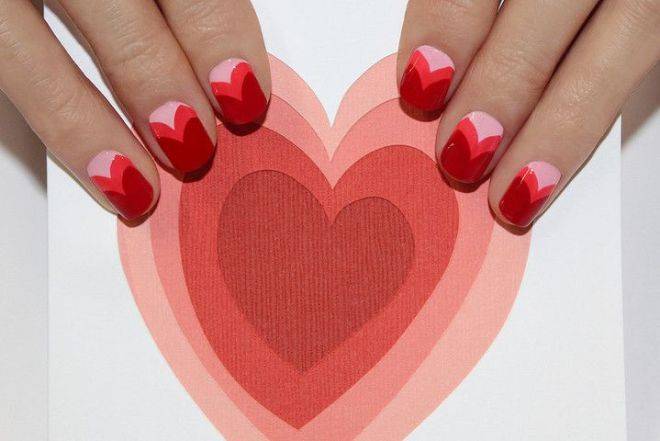 Мило и романтично смотрятся рисунки сердечек в сочетании с красным дизайном. Как правило красные или черные сердечки наносят на белый или нюдовый фон, на один или несколько ноготков. Кроме того, очень красиво смотрится этот дизайн покрытый матовым топом.