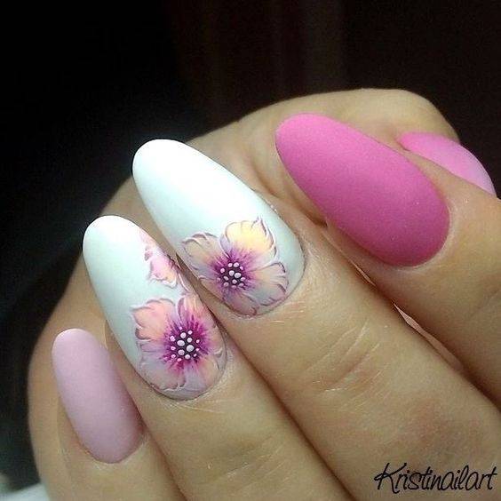 Среди романтичных натур популярны рисунки цветов, сердечек и бабочек. Лучше всего такие рисунки смотрятся на белой, молочной или нюдового цвета основе. Очень элегантно и романтично смотрятся рисунки роз, тюльпанов, маков и различных других красивых цветов.