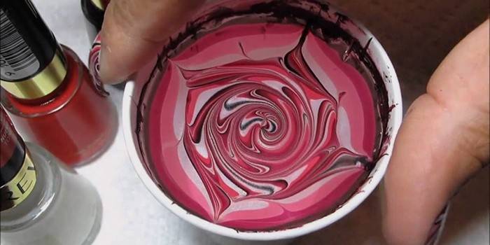 Принципы создания этого маникюра просты. Нужно всего лишь попеременно добавлять в чашку с водой лаки различных оттенков. Цветная пленка образуется на поверхности воды. И рисуя по ней зубочисткой, можно создать причудливые узоры и разводы. Разрешается придумывать абсолютно разные узоры: абстракция, изображения в виде лепестков, цветы и спирали.