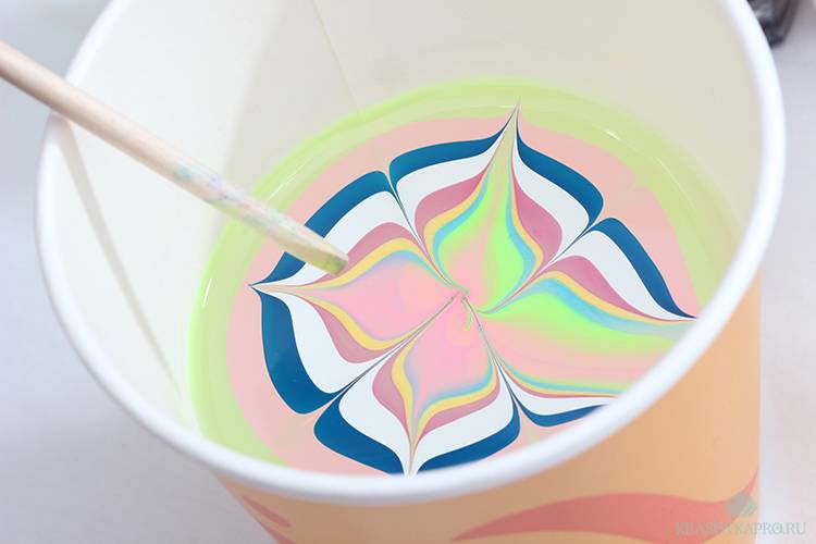 В воду в таком случае сначала добавляется капля белого лака, затем капля цветного и снова белого. И если хочется получить цветок, то просто зубочисткой можно нарисовать круглые лепестки.