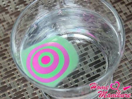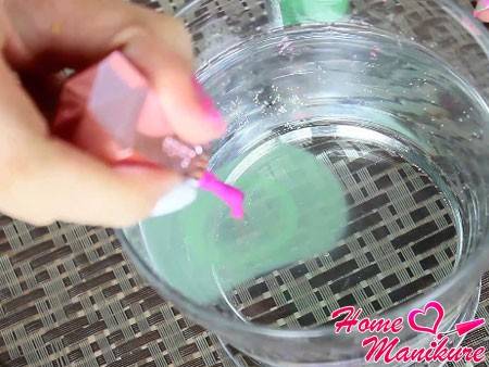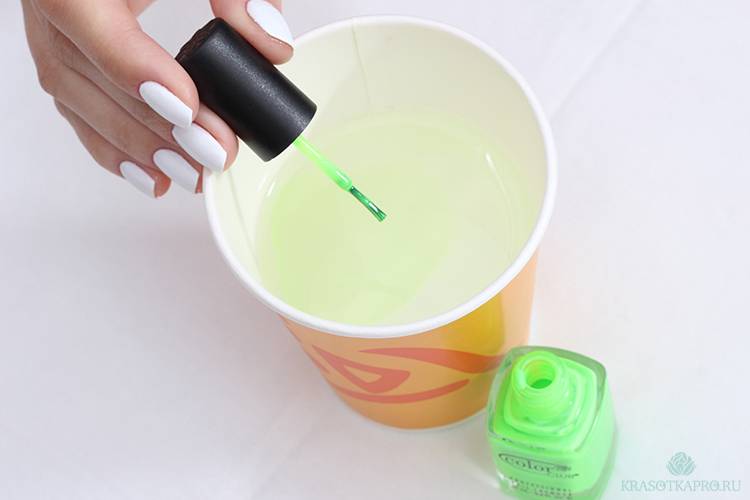 Дайте лаку хорошенько высохнуть. Подготовьте ёмкость с водой комнатной температуры или чуть теплее. Не наливайте слишком холодную воду, лак моментально застынет на поверхности, не успев стать узором на ваших ногтях.