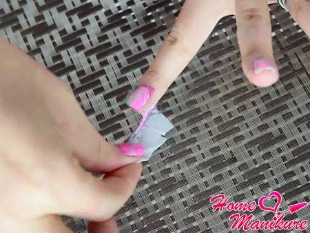 ВНИМАНИЕ! Если вам не хочется оттирать потом пальцы от лака, то необходимо заклеить кожу вокруг ногтя скотчем или смазать жирным кремом.