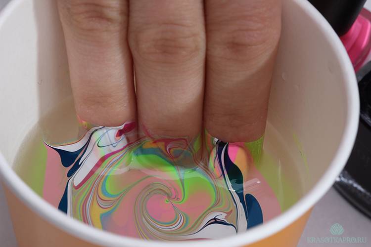 Когда водный узор будет готов, плавно опустите ноготь в разноцветную радугу параллельно плоскости стола. Пальчик должен полностью погрузиться в жидкость. Зубочисткой быстрыми скручивающими движениями соберите лишний лак с поверхности воды