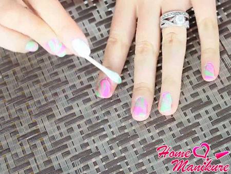 - Тем же, кто предпочитает «мраморные» покрытия, подойдут оттенки одной цветовой гаммы. Например, использование голубого, бирюзового, изумрудного дает восхитительный малахитовый тон. Также интересный маникюр получается смешиванием розового и пудрового оттенков – получаются очень нежные, романтические рисунки.