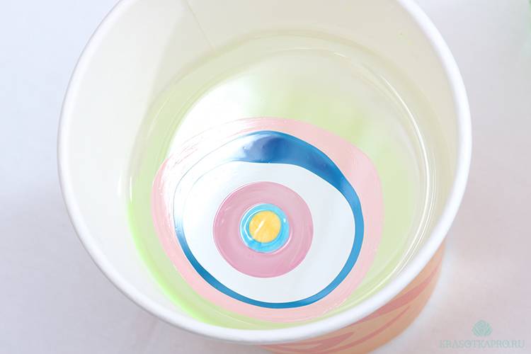 Каждый водяной круг должен растекаться к стенкам стакана. Вы можете помочь этому процессу, проводя зубочисткой от первого развода к бортику емкости. Не погружайте палочку слишком глубоко, она должна скользить по воде.