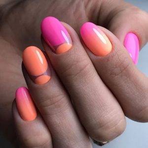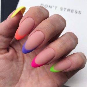 - Смелый оригинальный летний френч, сочетающий в себе цветную лилию ногтей и смешение цвета пластины;