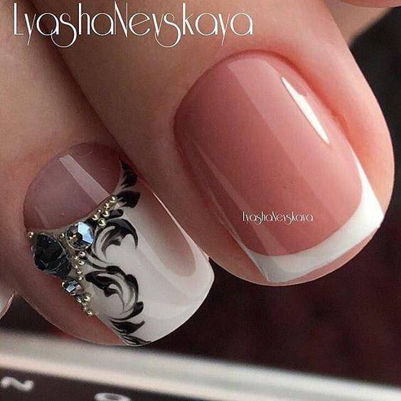 Французский маникюр. Классика никогда не перестанет быть популярной. Этот маникюр подходит и на каждый день и для особенного события, а если намечается какой-то праздник, то можно внести яркий штрих, добавив бусинки или стразы. Попробуйте синий лак — смотрится скромно, но очень стильно.