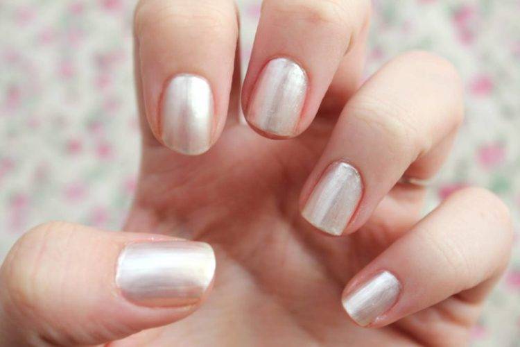 Ногти, покрытые маникюром жемчужного цвета, смотрятся нежно и в то же время скромно. Не стоит пытаться комбинировать жемчужное покрытие с разными другими. Ему подходят только однотонные цвета лака.