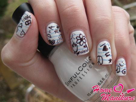Ногти можно украсить по типу газеты. Нарисуйте на них цифры, буквы, знаки и другие символы. Главное – не делать такой маникюр в тот день, когда намечена контрольная работа. Учитель может подумать, что так школьница подготовила для себя шпаргалку.