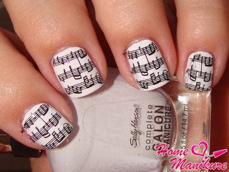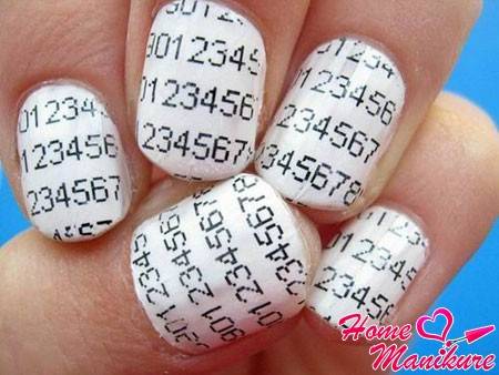 - Газетный маникюр. Газетные принты, буквы, цифры, нотный стан будут великолепно смотреться на ноготках каждой модницы.