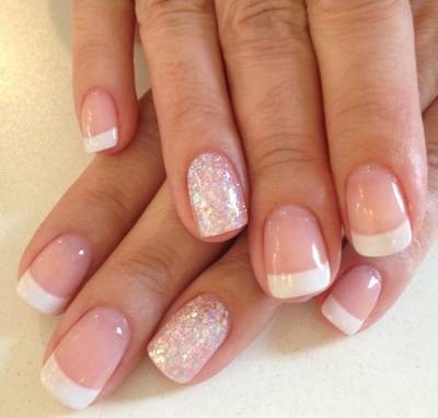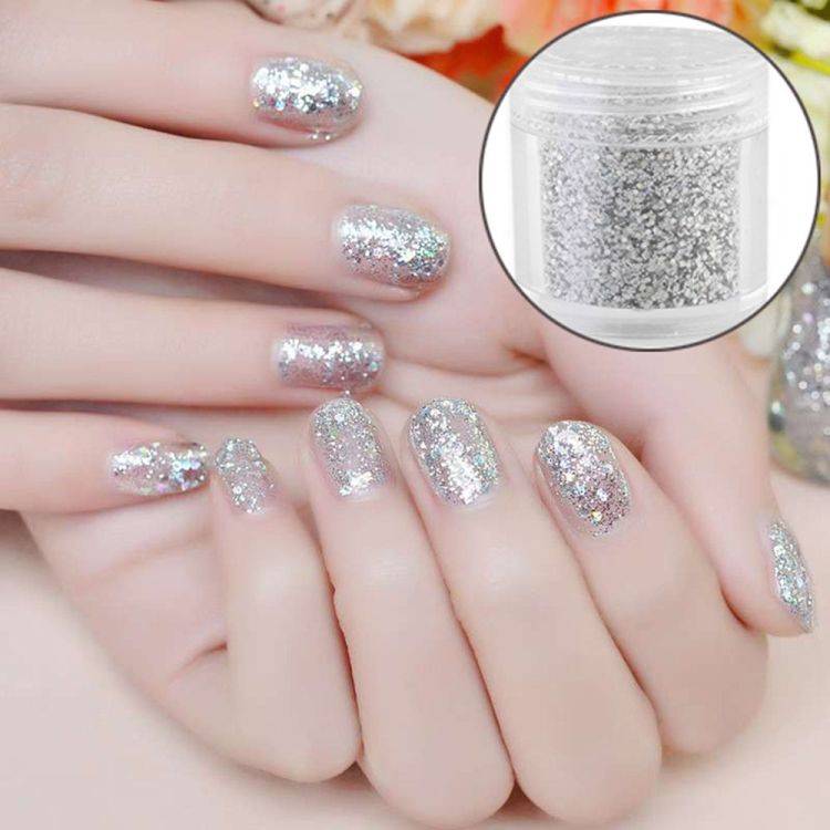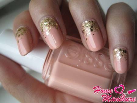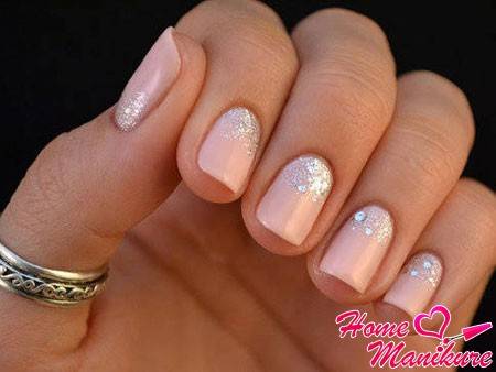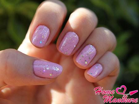 - С добавлением блёсток. Прекрасное дополнение к прозрачному лаку. Лучше если это будут выдержанные цвета — металл серебра или золота.