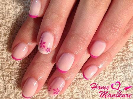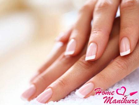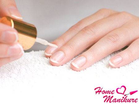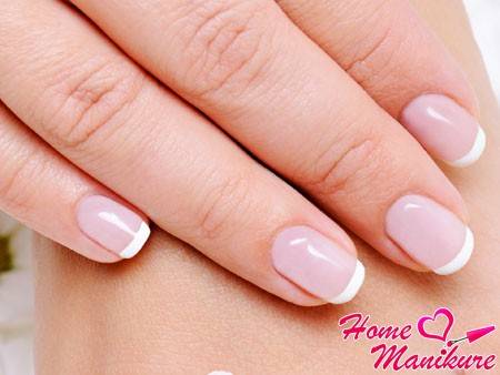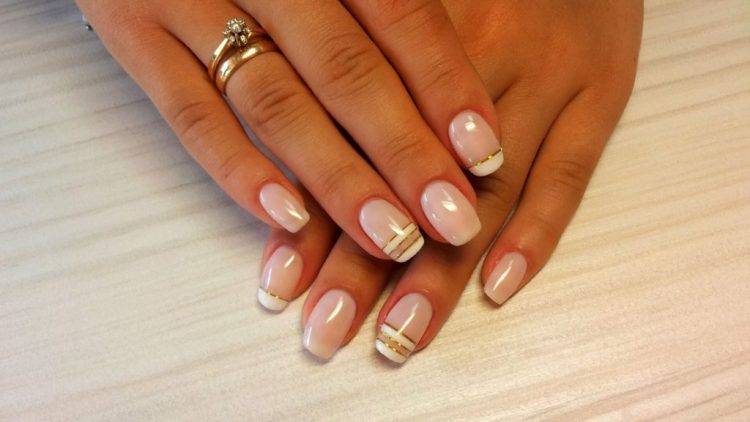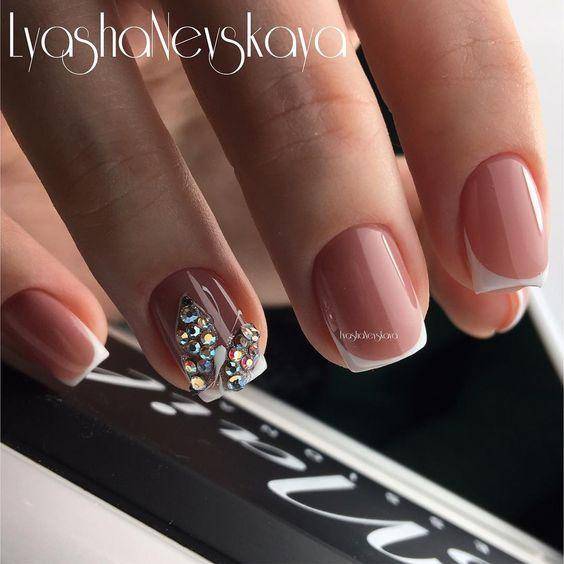 Для базового цвета подойдёт персиковый, пастельный, розовый цвет, а кончик ногтя, так называемая «улыбка» делается с помощью белого лака.